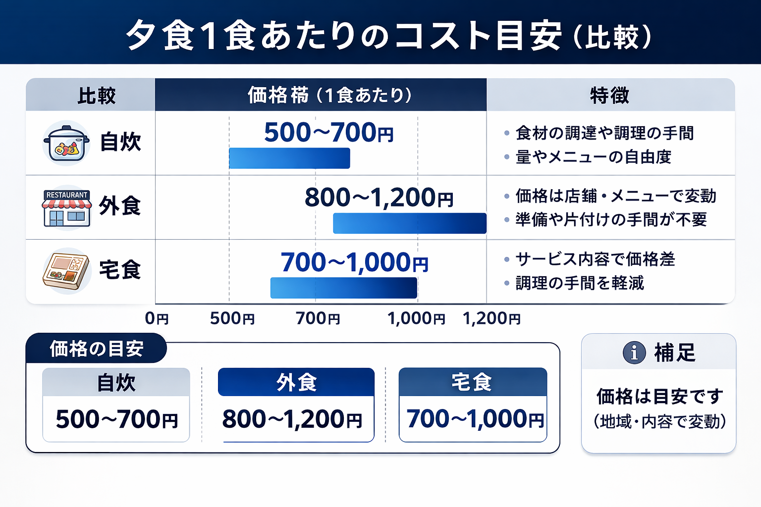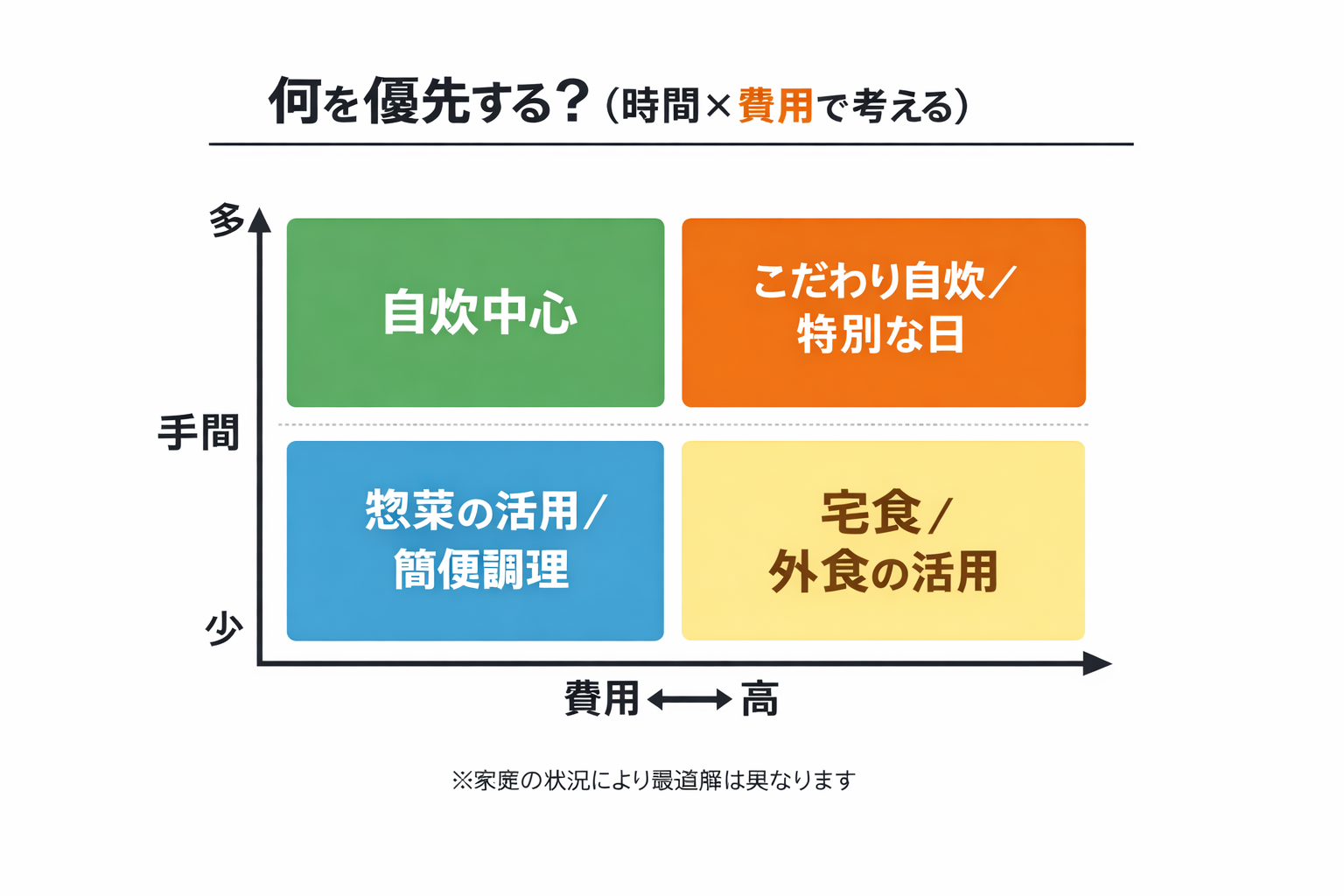 自炊・惣菜・宅食・外食は、単純な優劣ではなく“何を優先するか”で選び方が変わります。