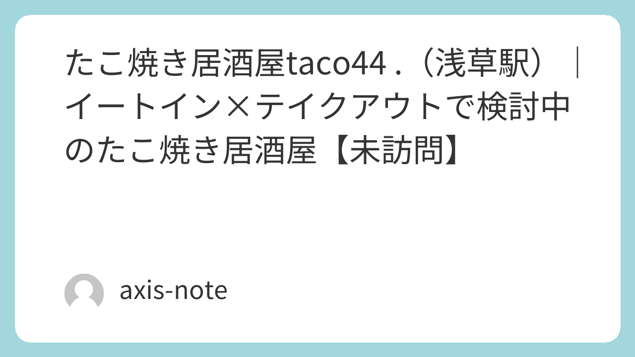 たこ焼き居酒屋taco44 .は、浅草駅エリアでたこ焼き居酒屋を検討する際に、イートインとテイクアウトの両方の使い分けができる店舗として整理しています。現時点では未訪問のため評価は行いませんが、浅草グルメの中で軽食・軽飲み用途の候補として引き続き情報確認を行う対象です。